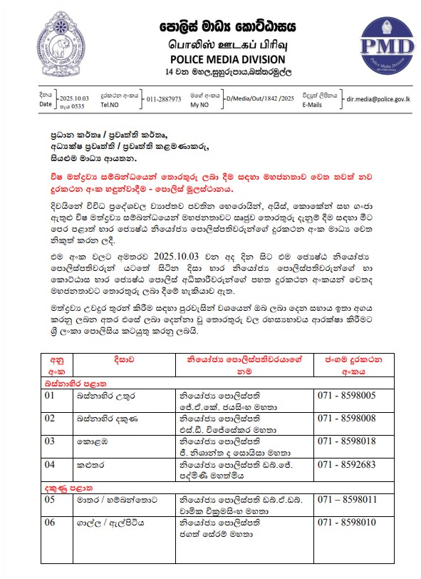 දිවයින පුරා ව්යාප්ත වී ඇති හෙරොයින්, අයිස්, කොකේන් සහ ගංජා ඇතුළු විෂ මත්ද්රව්ය සම්බන්ධයෙන් මහජනතාවට සෘජුව තොරතුරු දැනුම් දීම සඳහා පොලිස් මූලස්ථානය විසින් අද (2025.10.03) සිට ක්රියාත්මක වන පරිදි තවත් දුරකථන අංක සමූහයක් හඳුන්වා දී තිබෙනවා.