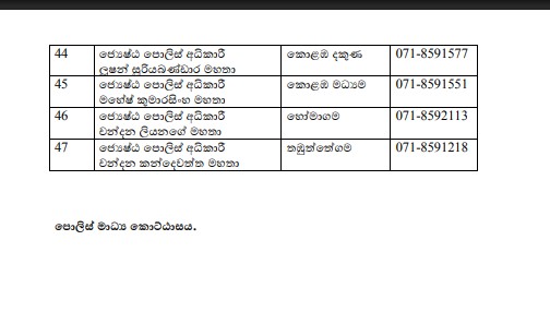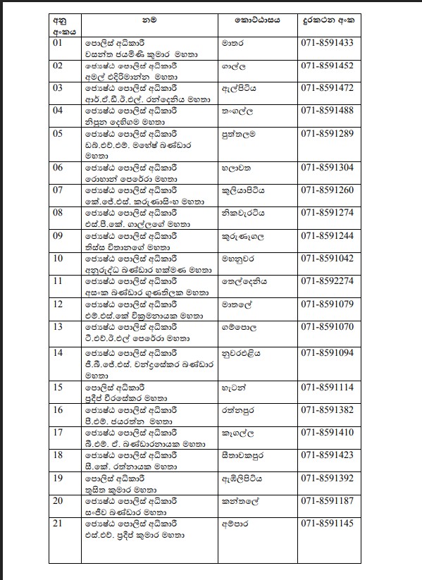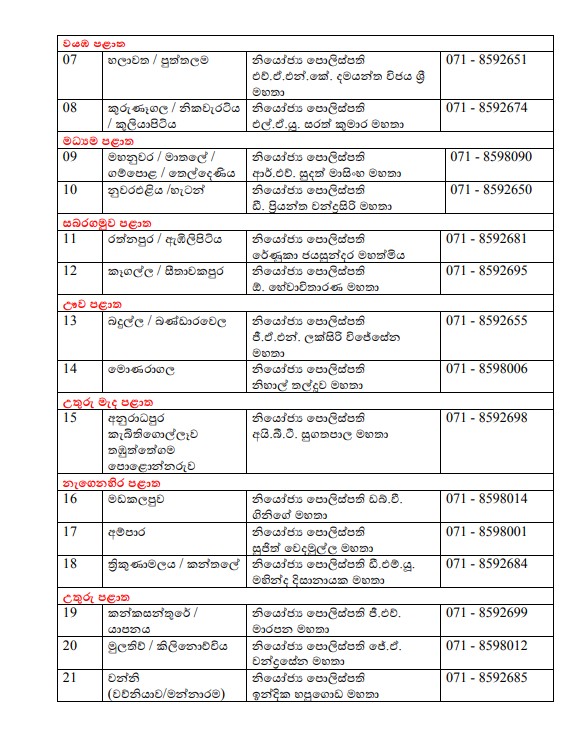 මීට පෙර, පළාත් භාර ජ්යෙෂ්ඨ නියෝජ්ය පොලිස්පතිවරුන්ගේ දුරකථන අංක මාධ්ය වෙත නිකුත් කර තිබූ අතර, එම අංකවලට අමතරව දැන් එම ජ්යෙෂ්ඨ නියෝජ්ය පොලිස්පතිවරුන් යටතේ සිටින දිසා භාර නියෝජ්ය පොලිස්පතිවරුන්ගේ සහ කොට්ඨාස භාර ජ්යෙෂ්ඨ පොලිස් අධිකාරීවරුන්ගේ දුරකථන අංක වෙතද මහජනතාවට තොරතුරු ලබා දීමේ හැකියාව පවතින්වා.