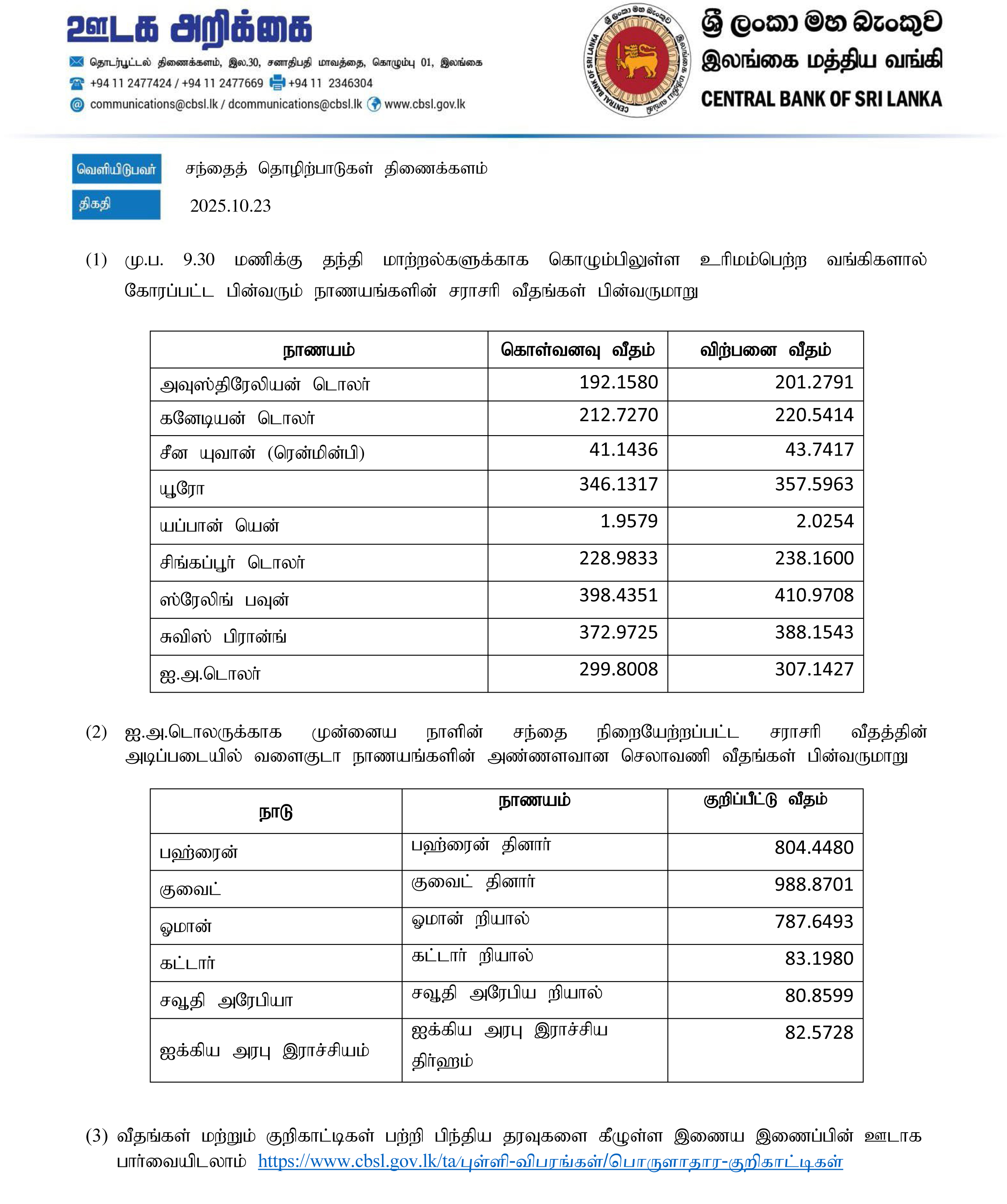 இலங்கை மத்திய வங்கி இன்று (23) வெளியிட்டுள்ள உத்தியோகபூர்வ நாணய மாற்று விபரங்களின் அறிக்கை கீழே இணைக்கப்பட்டுள்ளது.